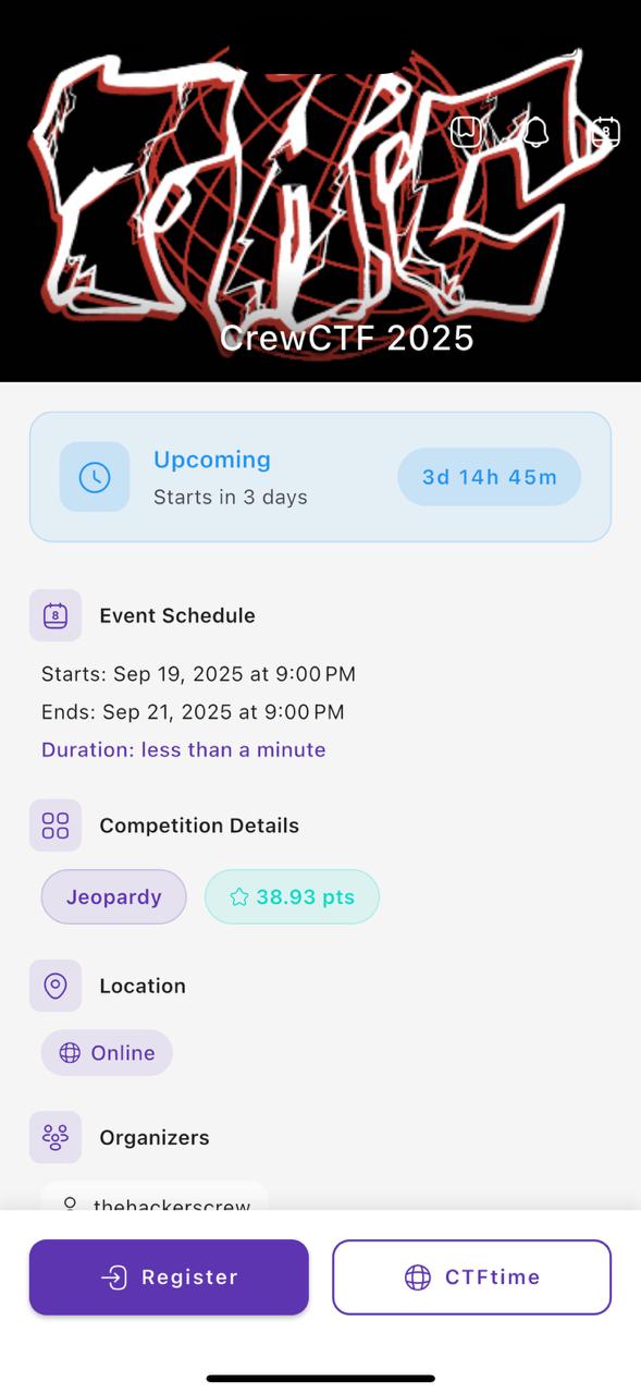 Browse upcoming CTFs, filter and search, bookmark favorites, set reminders, and add events to your calendar. Stay in the loop with a clean, fast experience.